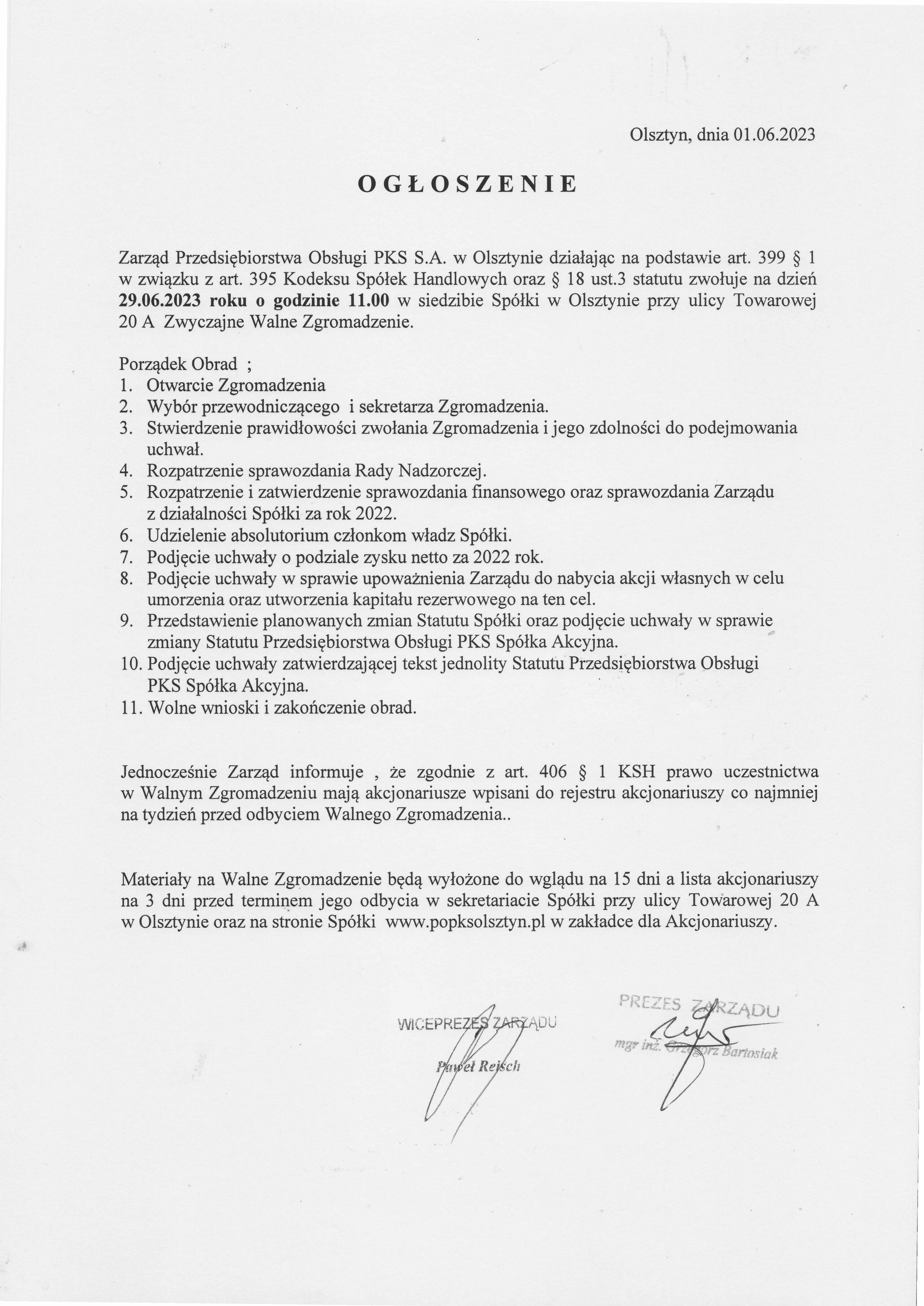 Ogłoszenie o zwołaniu Walnego Zgromadzenia Akcjonariuszy w 2023 roku
